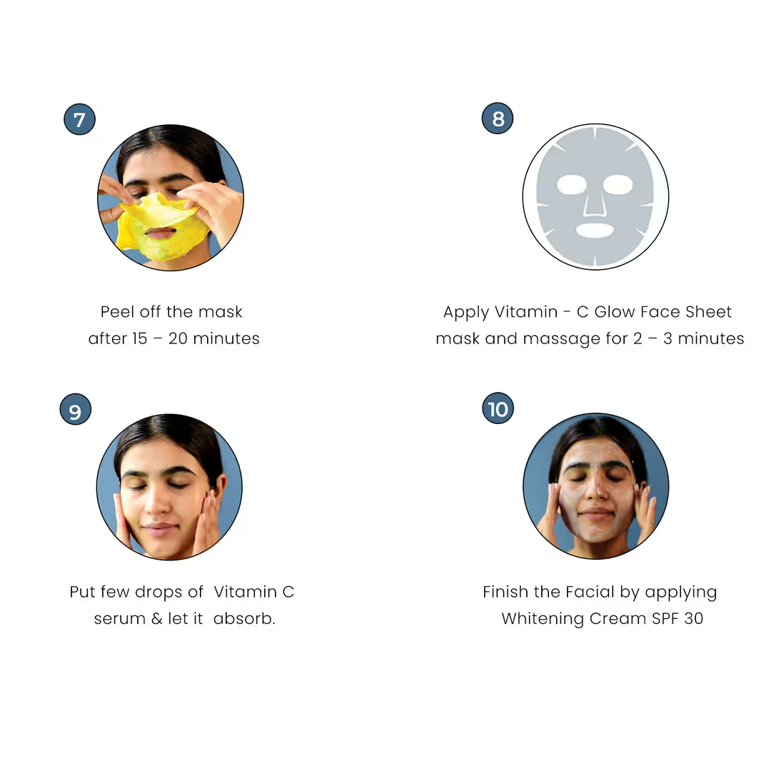 - Clean the face thoroughly with Vit-C cleanser followed by micro-dermabrasion scrub for exfoliation. Apply Vitamin C tonic on the face followed by the massage cream & wait for 7-10 minutes for absorbing.