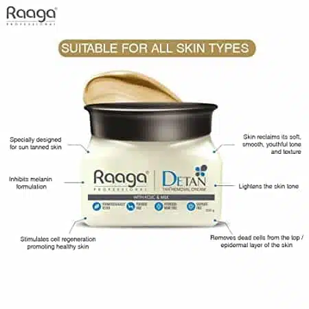 Raaga Professional De Tan Cream brings you the power of nature. Its unique formulation contains scientifically extracted actives of fruits and Kojic acid, Milk & Honey, help to remove the skin tan due to over exposure to sun. The Kojic acid present in the products helps to inhibit the melanin formation and lightens the skin tone on regular usage. Pure Milk & Honey help moisturizes and hydrates your skin. Raaga De-tan cream is a Skin-lightening product. This is a unique tan removing formula that lightens skin tone, removing tanning effect of the sun. This product is unique, in that, it doesn’t have any kind of colour lifting effect on facial hair like the normally used skin bleach